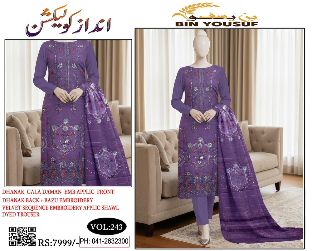 This premium Dhanak winter three-piece suit is a perfect blend of warmth and elegance. Crafted from high-quality Dhanak fabric, the outfit includes a finely designed shirt, a matching trouser, and a soft, warm dupatta. The rich texture and graceful fall of the fabric make it ideal for winter evenings, formal gatherings, and festive occasions.
